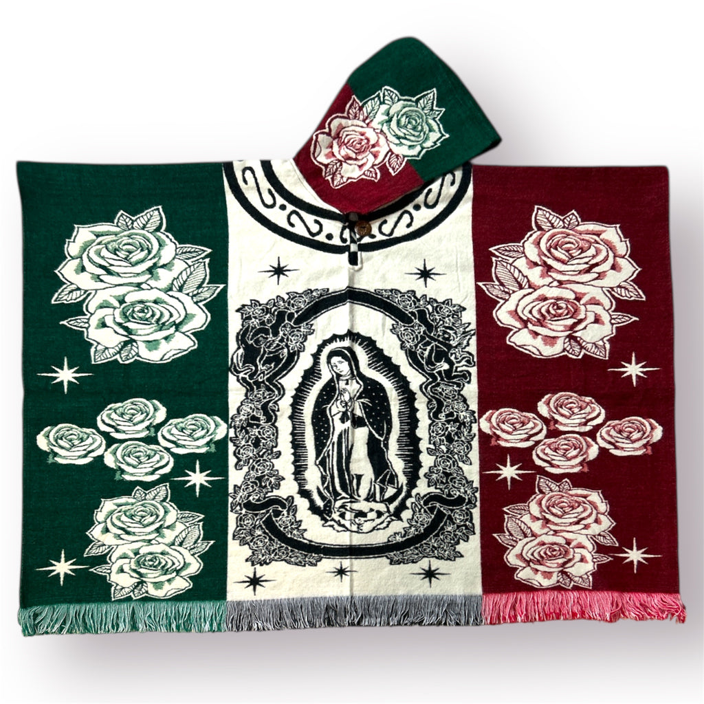 This handcrafted Poncho blends cultural beauty with spiritual meaning. 🌹✨ Made with 80% Alpaca wool and 20% Acrylic, it offers unmatched comfort while honoring sacred imagery. The central figure surrounded by blooming roses and radiant stars evokes protection, love, and faith. Soft red, green, and ivory tones represent heritage and grace.