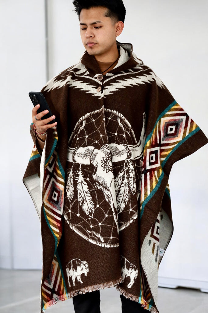 Strength of the warrior, spirit of the buffalo. 🦬🔥 This handcrafted Heritage Poncho is made from 80% Alpaca wool and 20% Acrylic, offering exceptional warmth and a design inspired by the resilience and power of the warrior spirit. The buffalo skull symbolizes strength, protection, and a deep connection to ancestral traditions, making this poncho a true mark of courage and endurance.