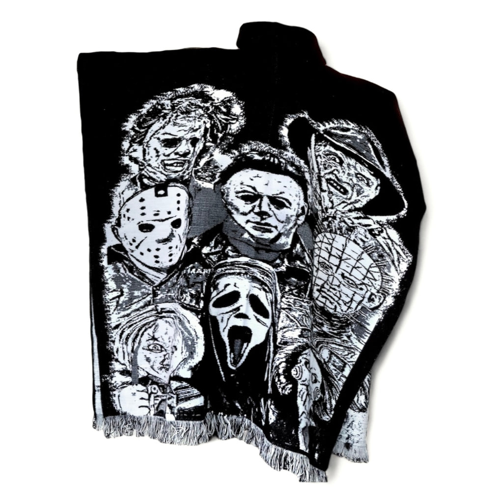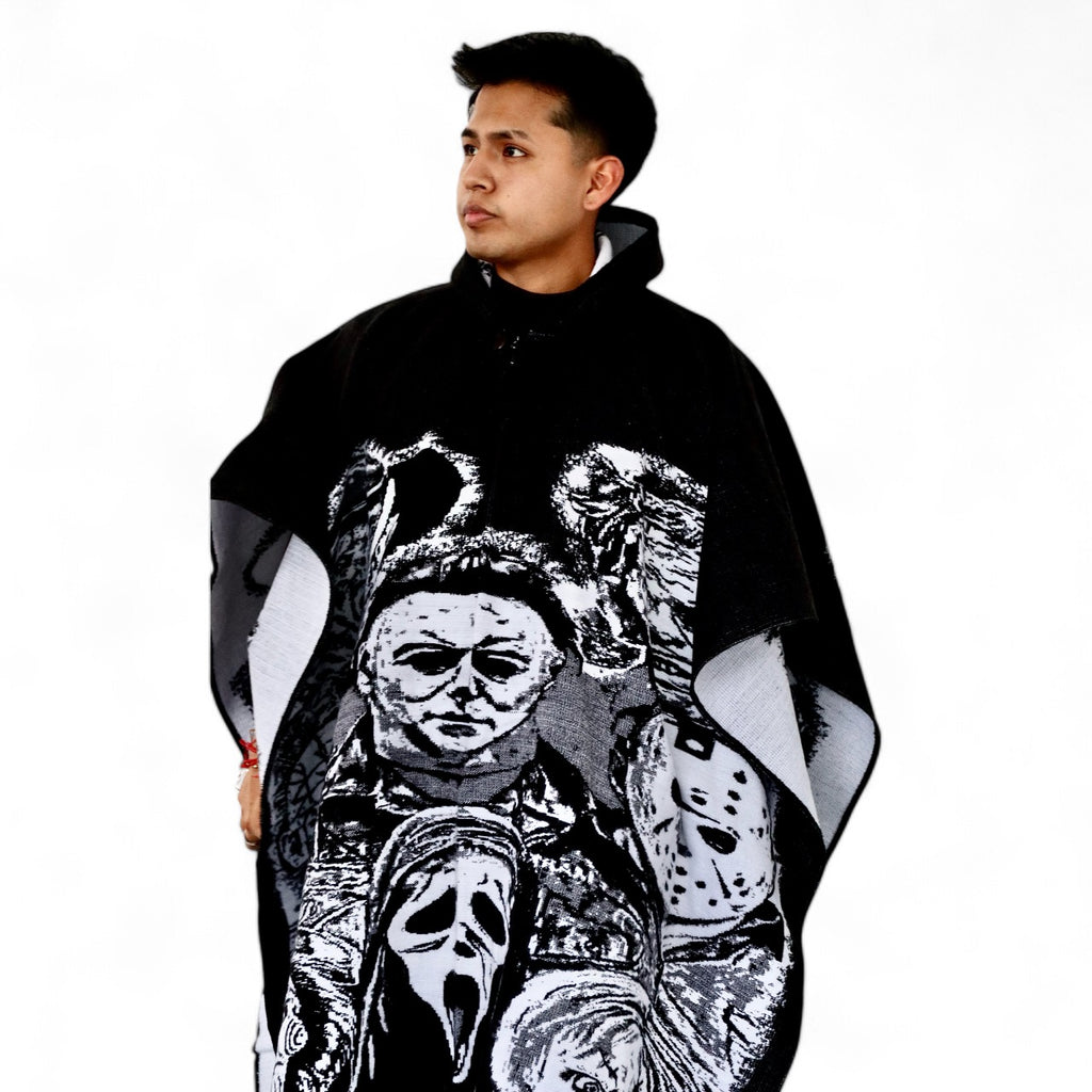 A gathering of legends, a cloak of terror. 🔪🔥 This handcrafted VIP Horror Poncho is made from 80% Alpaca wool and 20% Acrylic, blending premium warmth with a spine-chilling design. Featuring the most fearsome icons in horror history, this poncho is a must-have for those who embrace the thrill of the unknown.